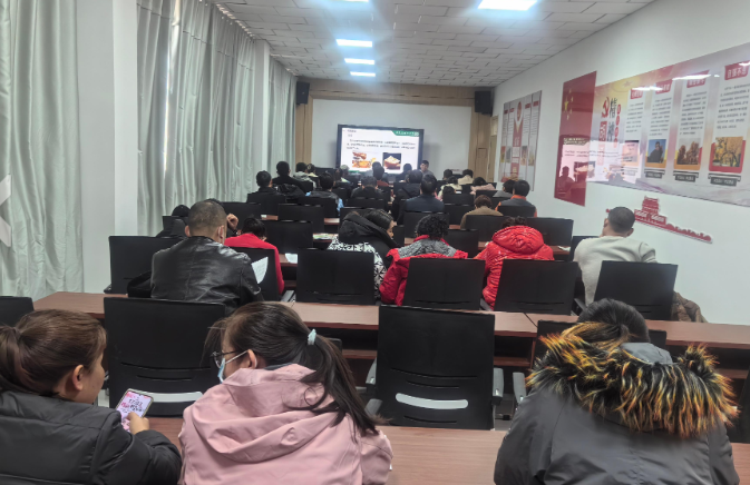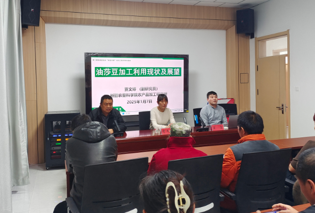 1月7日,贾文婷副研究员、王霆助理研究员前往54团开展“科技兴村”示范基地和“三区”科技人才培训和授牌活动。54团农发办主任谭志发出席并主持了此次活动,农发中心、连村两委等120余人参加了此次培训活动。培训会上,贾文婷副研究员向团里介绍了目前团队关于有莎豆精深加工利用情况以及科技示范基地和人才培养示范基地建设主要内容和前期工作开展情况。谭志发主任对团队所做的工作表示肯定,强调团里将积极协助‘科技兴村’服务团队开展工作,同时也希望能与科技特派团队多沟通多交流,做好连村本土技术人才培养、技术示范推广等工作。在培训会议上与参与培训的职工群众进行现场的交流,54团一连职工努尔麦麦提·图尊说道:“这次培训让我们增强了种植油莎豆信心了,希望以后能多举办这样的活动”。此次培训农户120人,发放食用油安全科普知识手册120本。培训会议结束后开展了“油莎豆精深加工农业科技示范基地”、“食用油安全乡土科技人才培训示范基地”授牌。