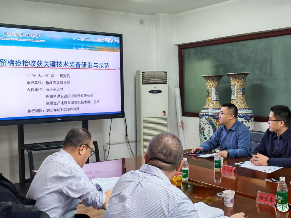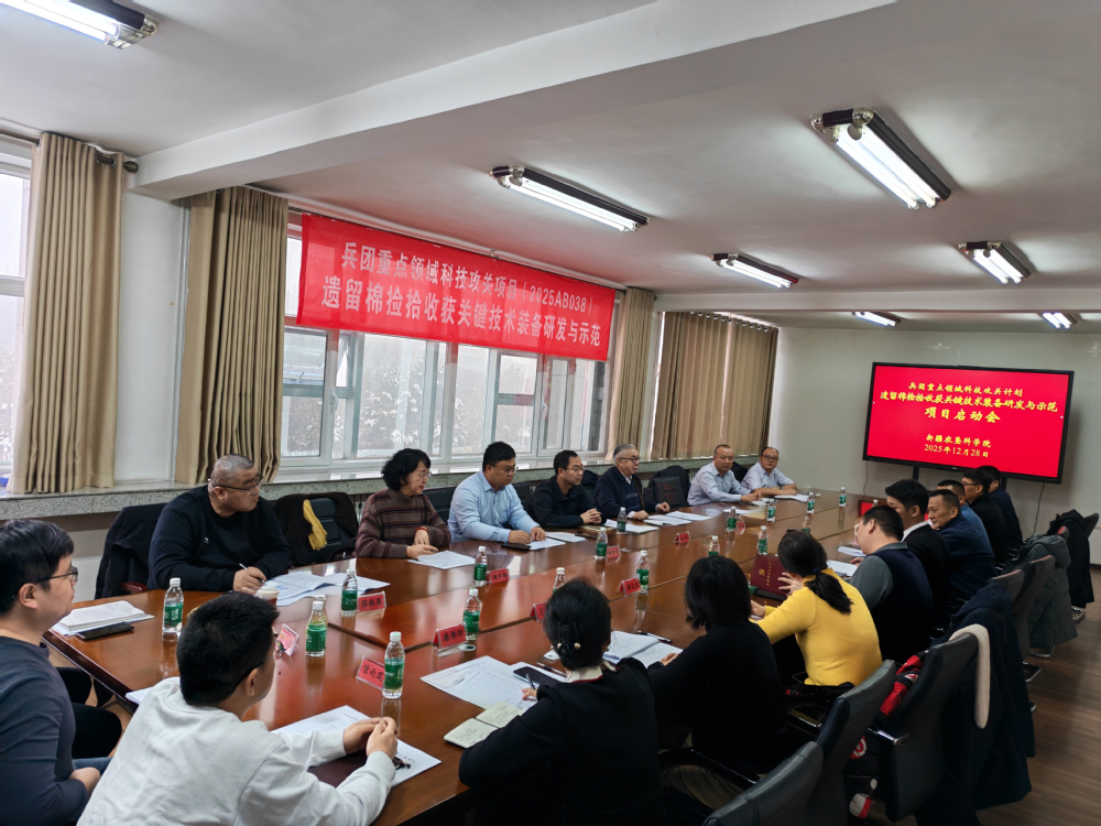 2025年12月28日,由新疆农垦科学院何磊研究员主持的兵团重点领域科技攻关计划“遗留棉捡拾收获关键技术装备研发与示范”项目启动会在我院四楼会议室召开。会议特邀中国工程院院士陈学庚研究员、石河子大学温浩军研究员、新疆农业大学张佳喜教授、南京农业大学傅秀清研究员、新疆维吾尔自治区农业科学院牛长河研究员、新疆农垦科学院沈从举研究员,以及杨冬梅高级会计师等多位专家莅临指导。院科研管理处张斌副处长出席会议。启动会由生物技术(智慧农业)研究所曹肆林所长主持。